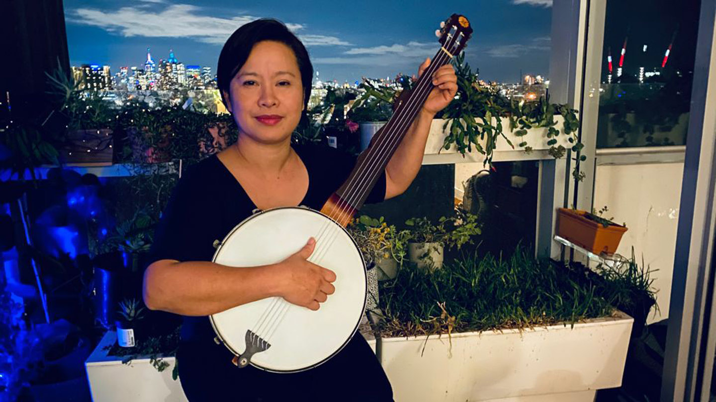 Kim with her Levi Brown banjo in Melbourne, Australia